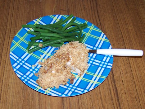 Open the chicken breast package and pt them on a plate. Once that is completed, take servings of Special K cereal and crush them into a bowl. Then, fill a pan with milk. Once the milk is placed, dip the chicken into the milk and let it soak for 30 seconds. Then, dress the chicken with the Special K cereal to make the crust. Once this is completed, place the chicken in the oven for 25 minutes.To cook the green beans, un-package them and place them in a pan of boiling water. Once they are cooked properly, they can be served next to the chicken. When serving the chicken, consider each breast as a serving. Therefore the final dish should have 1 serving of baked crusted-chicken with 1-2 servings of green beans.